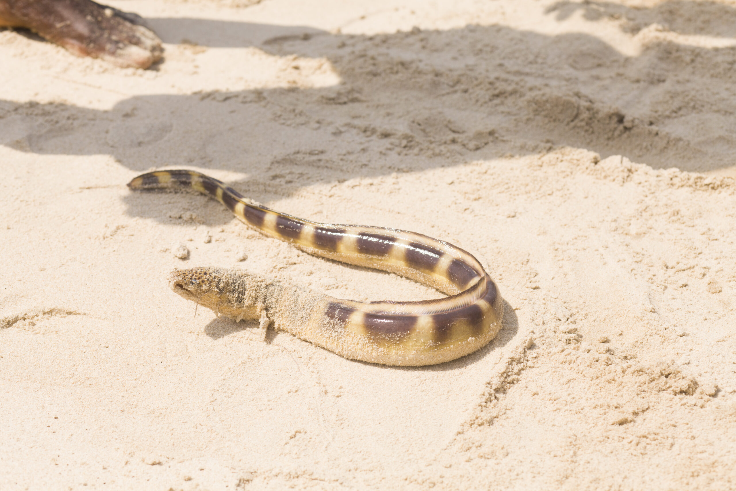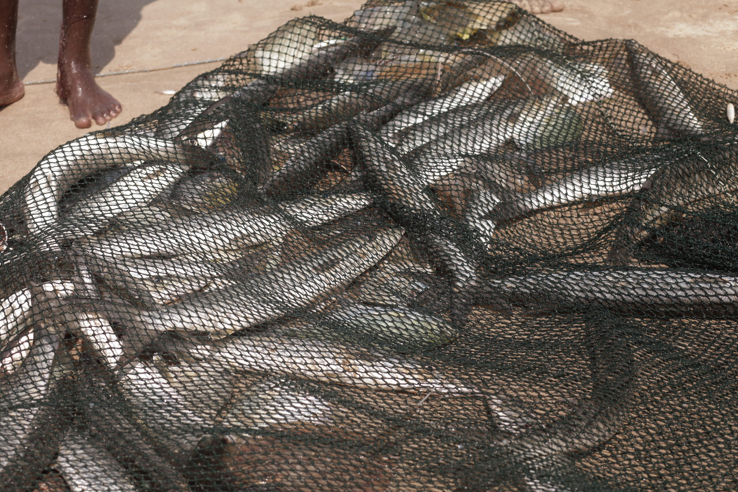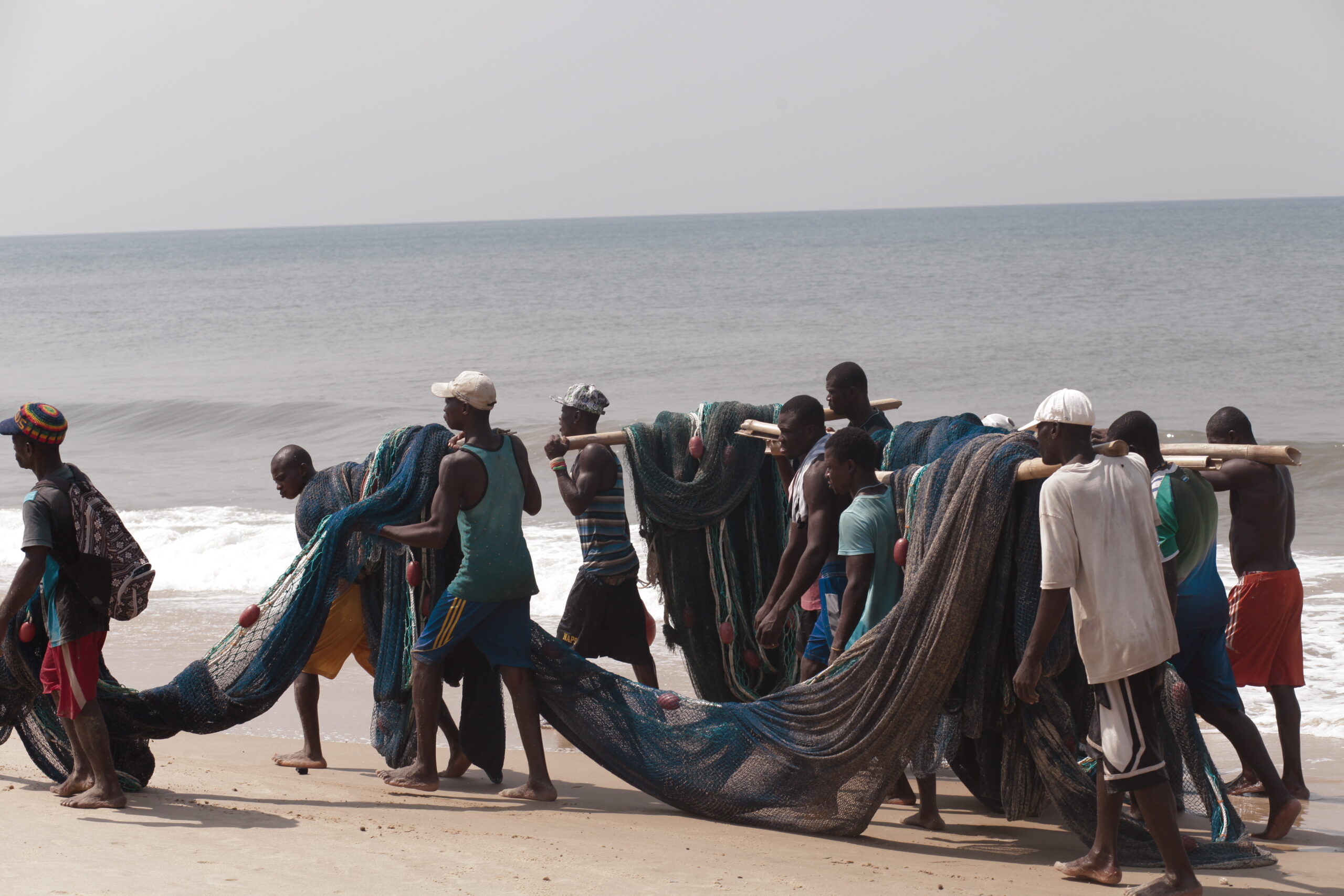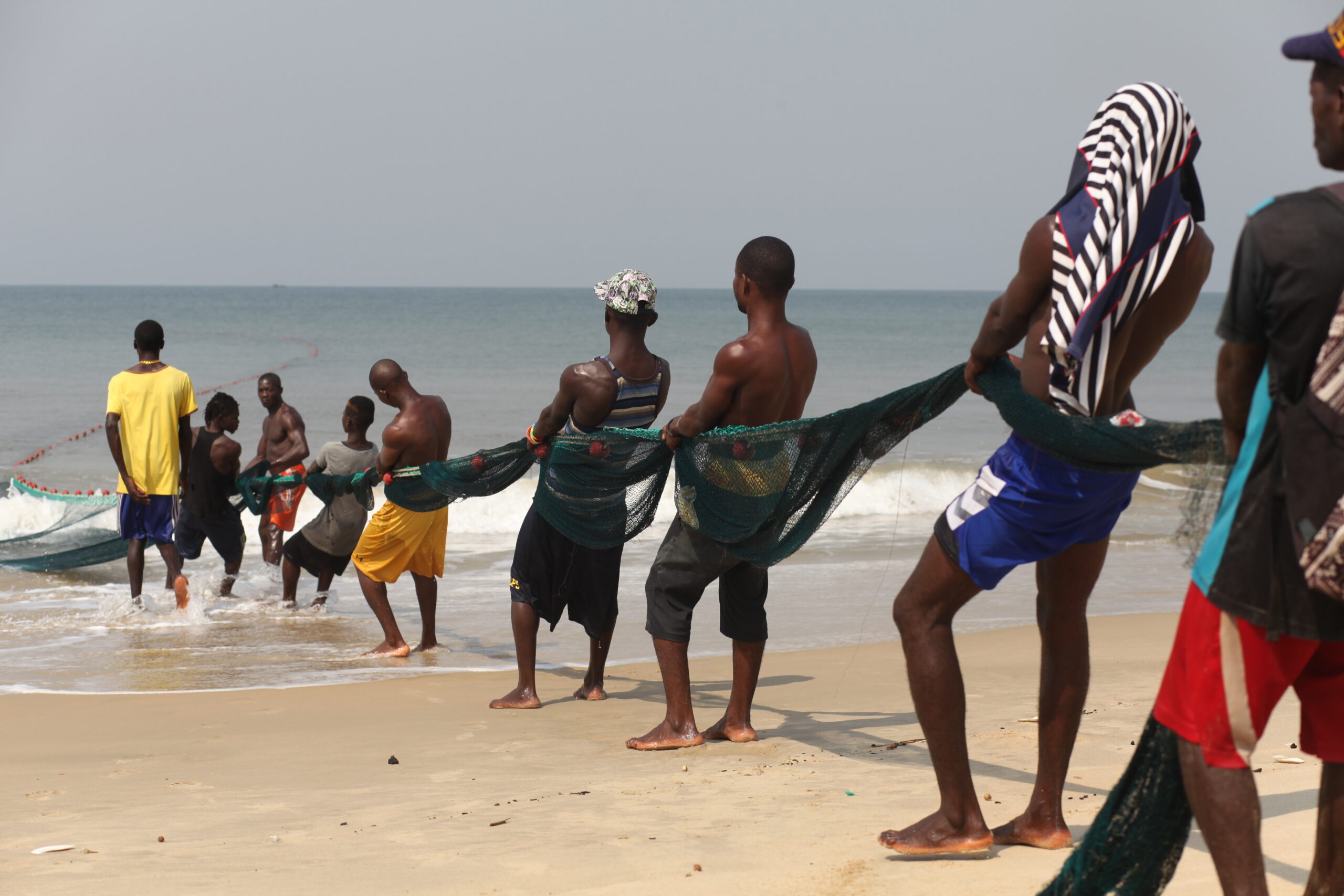While the men on land work to pull in the net, another heads out (in this case) in a red and white canoe. Known simply as ‘OBlacks’, his job is to push the line from the sea offshore for those drawing the net. This toing and froing with the net and canoe can last as long as 3 hours. They start work at about 5am and are often wrapped up and gone by 8 am.