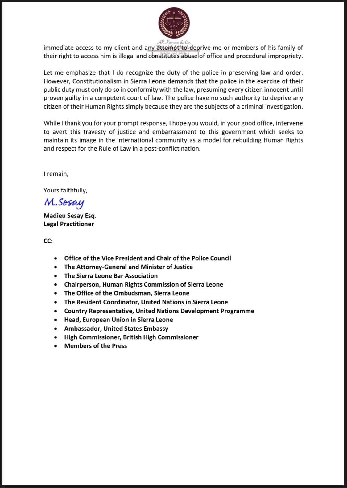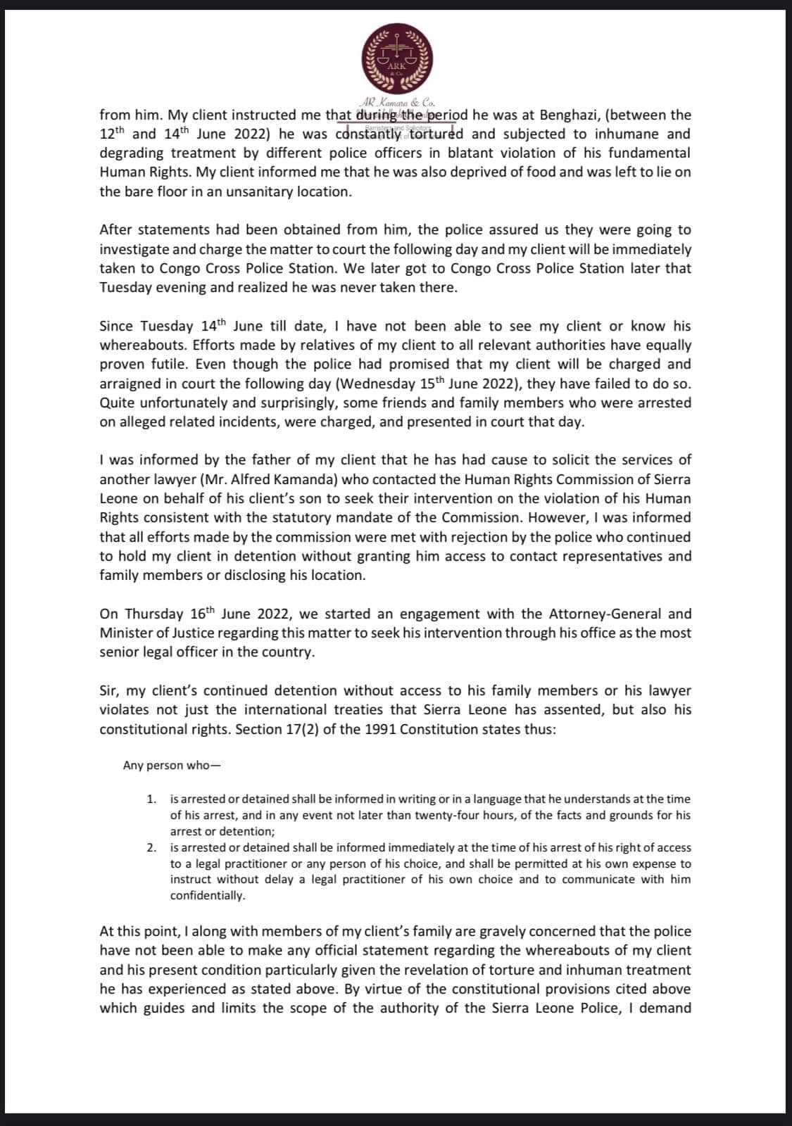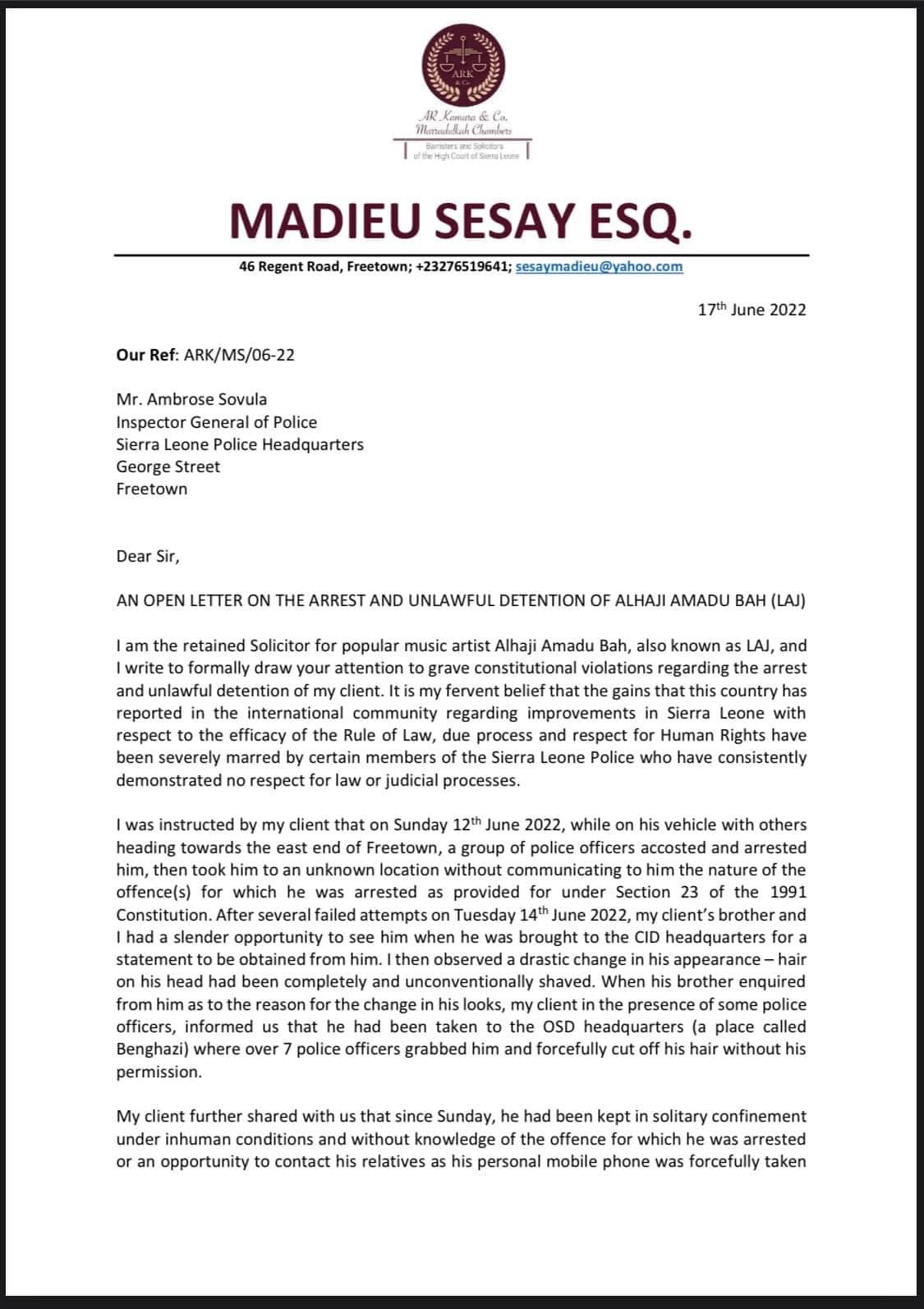 In an open letter addressed to the Inspector General of the Sierra Leone Police, LAJ’s lawyer, Madieu Sesay Esq, has claimed that his client has been subjected to inhumane treatment while in police custody.