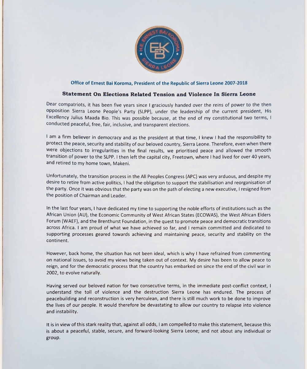 “I am calling on all champions and defenders of democracy, human rights, the rule of law and peacebuilding; especially the United Nations, the African Union, the European Union, ECOWAS, the Commonwealth Secretariat, Governments of the United Kingdom, the United States of America, Nigeria, Guinea and Ghana, to pay close attention to Sierra Leone. You should make your voices heard in the protection of peace, democracy, and the rule of law in our beloved nation,” said Dr. Koroma.
