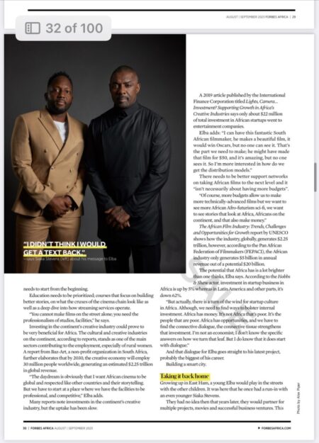 Forbes Africa Magazine recently featured the multi-talented Idris Elba, shedding light on his ambitious new ventures, which include investing in the continent’s movie industry, his work around building Sherbro Island City in Sierra Leone, and as a humanitarian tackling the climate crisis and lending a helping hand to farmers in Africa.