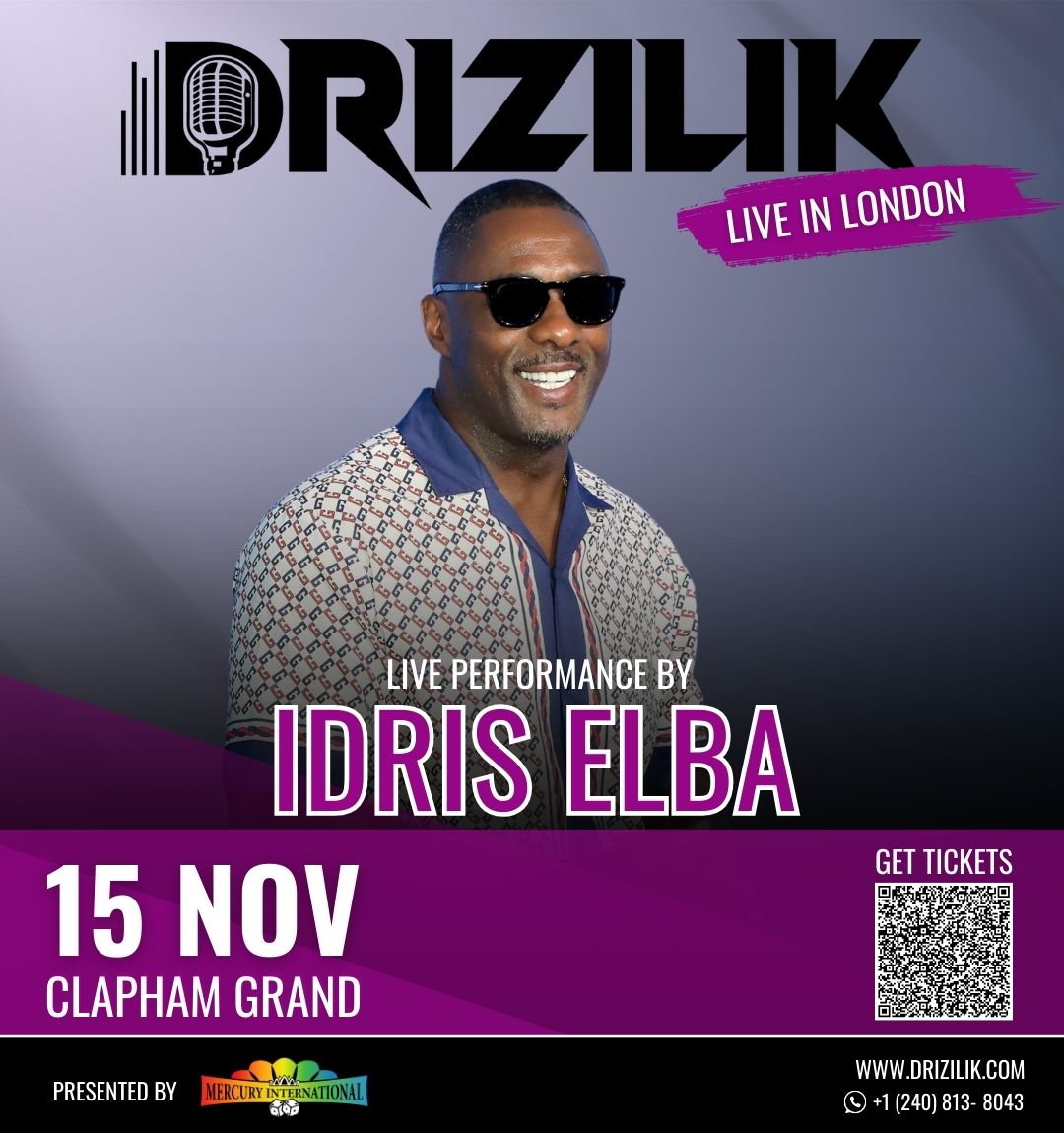 For one night only, East Londons’s Idris Elba will join British and Sierra Leonean artists performing at Drizilik’s live concert in London. While he is widely recognized as a household name in Hollywood, Idris is a highly sought-after DJ, music producer, and chart-topping musician.